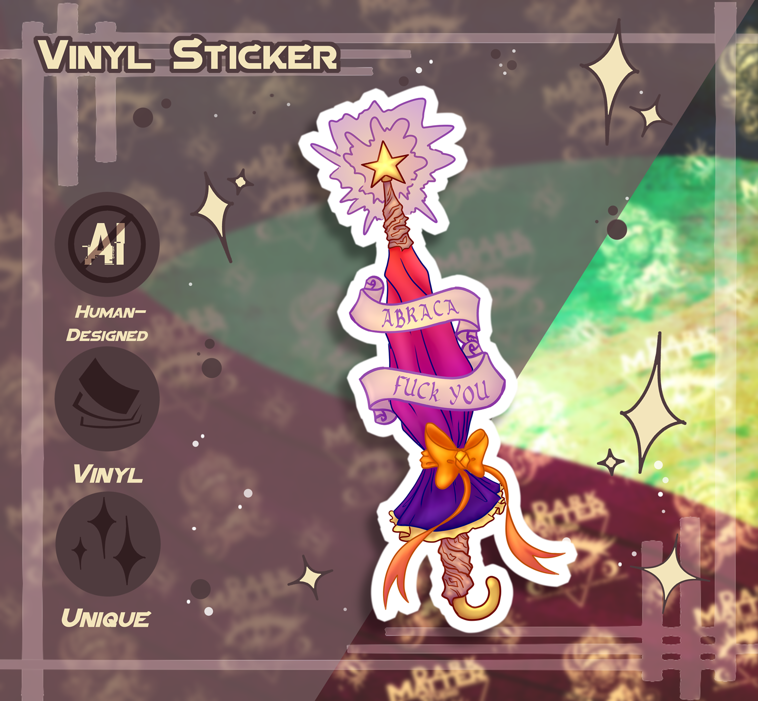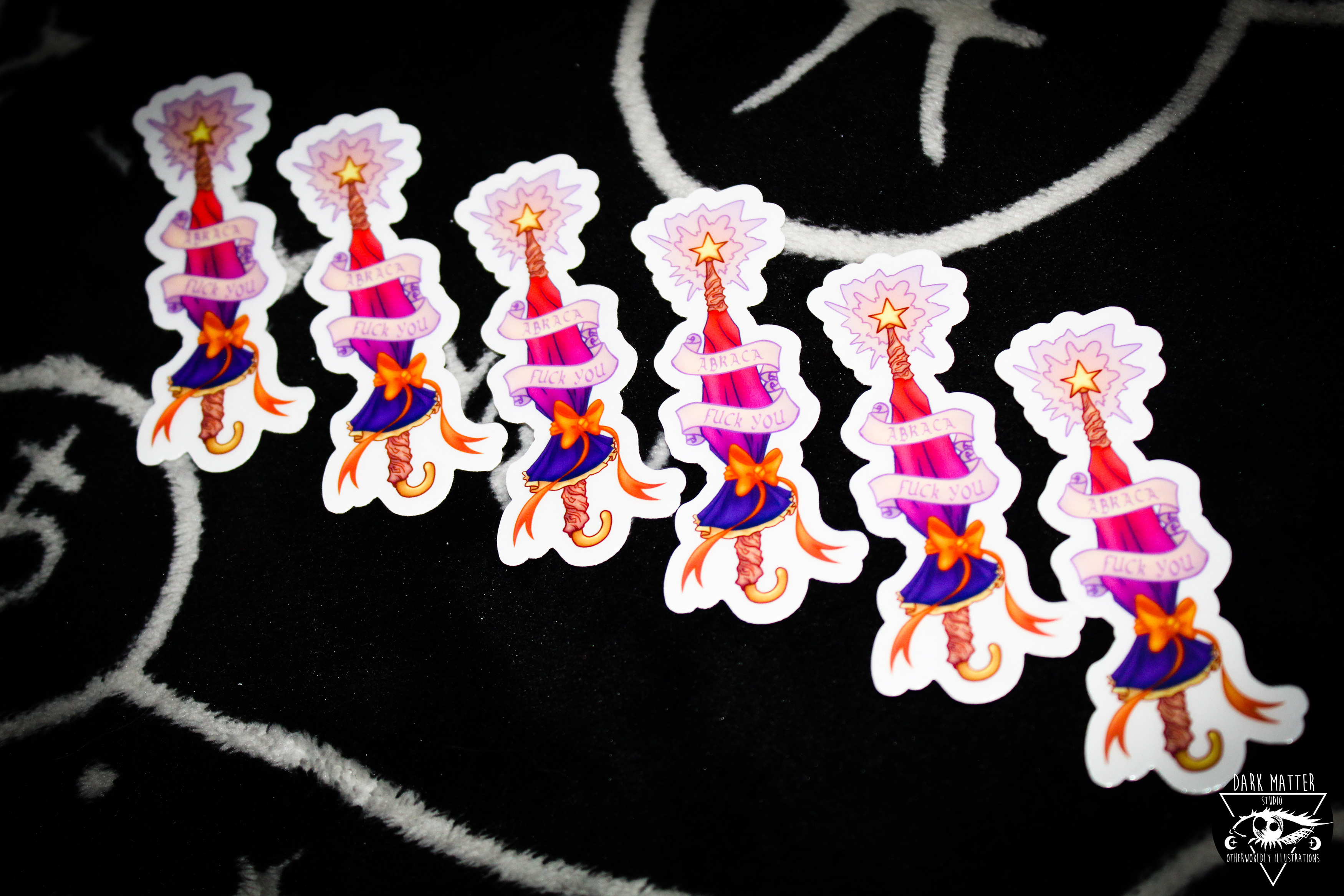 Abraca FXCK You vinyl stickers are 1.97x3" in dimension, premium vinyl, and are finished with a protective laminate to protect them from wind, rain, and sunlight. You can place these stickers anywhere and they'll be okay~!