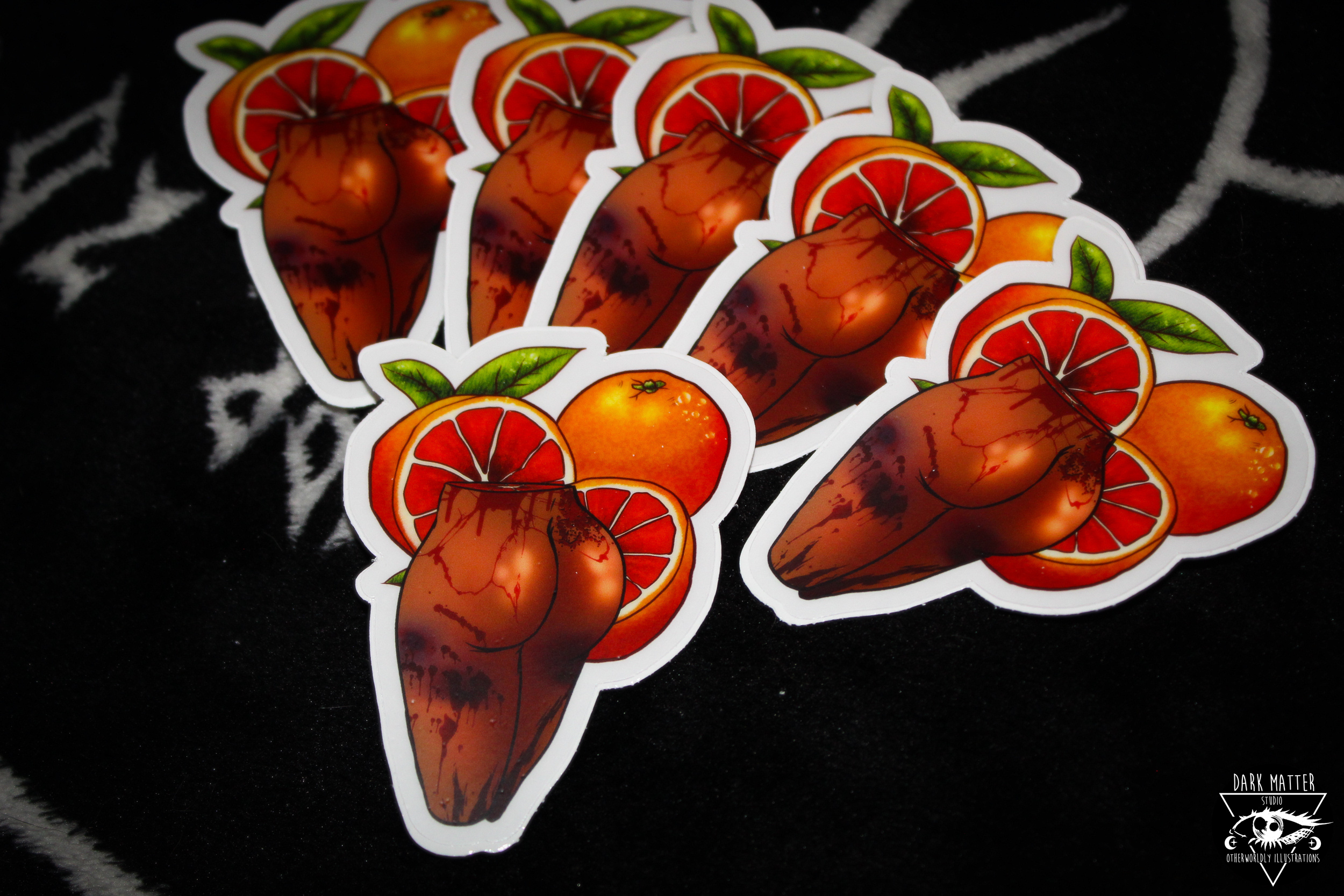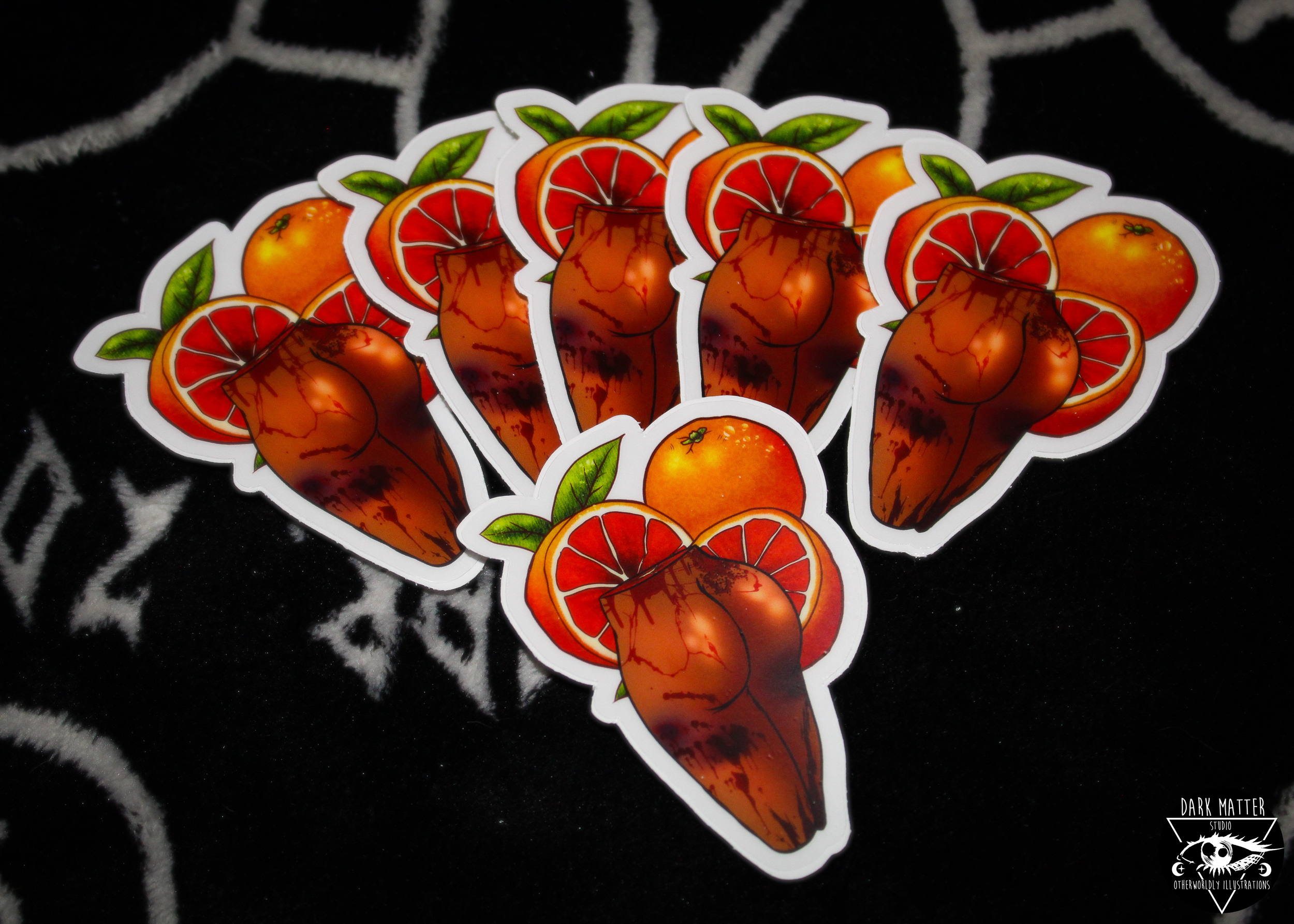 Anatomically Correct Blood Orange vinyl stickers are 2.76x3" in dimension, premium vinyl, and are finished with a protective laminate to protect them from wind, rain, and sunlight. You can place these stickers anywhere and they'll be okay~!