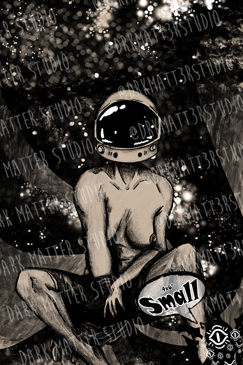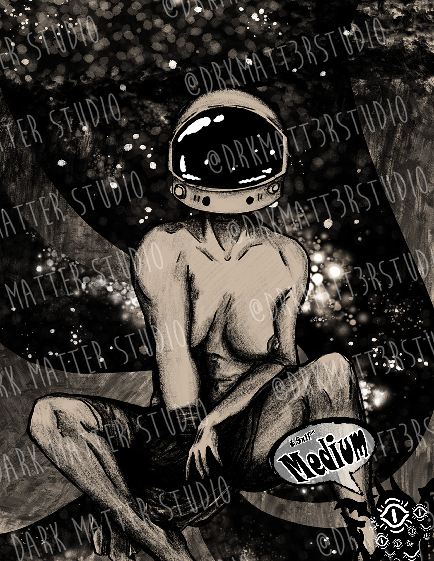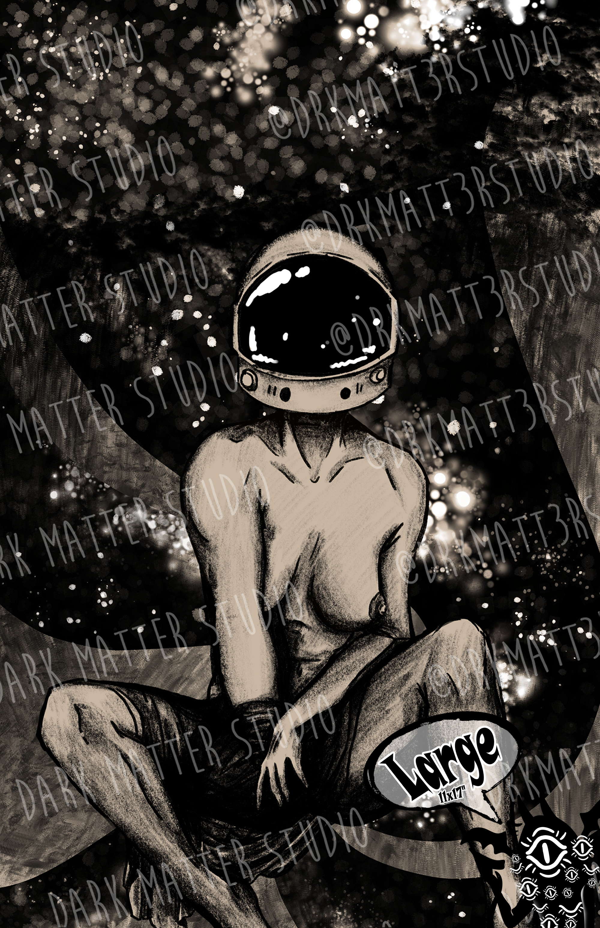 An original illustration of mine, another of my more risqué designs. Birth of the Universe depicts a woman wearing an astronaut mask, its surreal, its feminine, its divine.