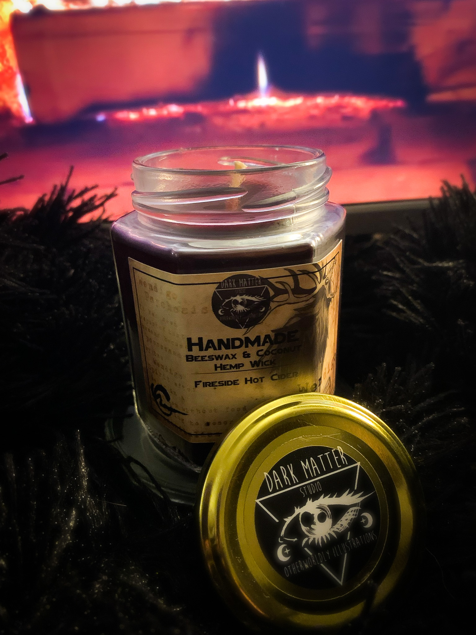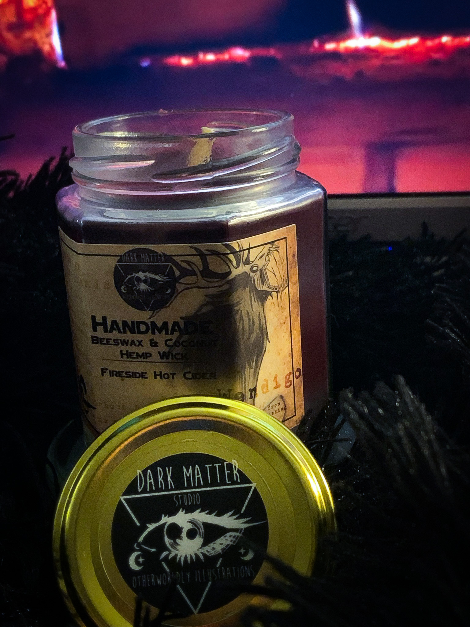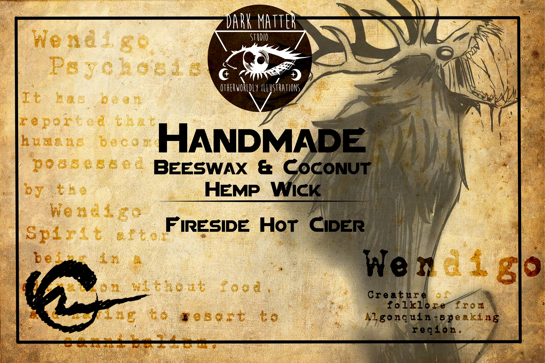 Organic white beeswax candles, made with coconut oil to help burn more evenly, and a hemp wick to make sure your wick burns at the same speed as the wax melts! Hand blended color and scent, 6oz, glass jar with metal cap.A blend of campfire, fresh cut wood, apple cider, pomegranate, smores, and a hint of dirt to give that lovely Autumn feeling of sitting besides the campfire with a nice hot cup of cider. This is a part of my Cryptid Studies collection, and this scent is inspired by the my Cryptid Studies Wendigo design. I wanted something that gave a soothing scent-sation of good fall memories, while also bringing out that woodsy aroma so classically associated with tales of the Wendigo spirit. The fragrance is not so overpowering that it becomes irritating for those of the more sensitive variety when it comes to fragrances, and the best part about it? It's beeswax! What is so great about beeswax candles? They are long lasting for starters, so it'll last longer than a soy candle you buy from the drug store. Beeswax also releases negative ions when burning, which naturally purifies the air! It's perfect for allergens and asthma, and the added coconut oil means you can also use the melted wax as a moisturizer if you so choose since all the materials are skin-safe.