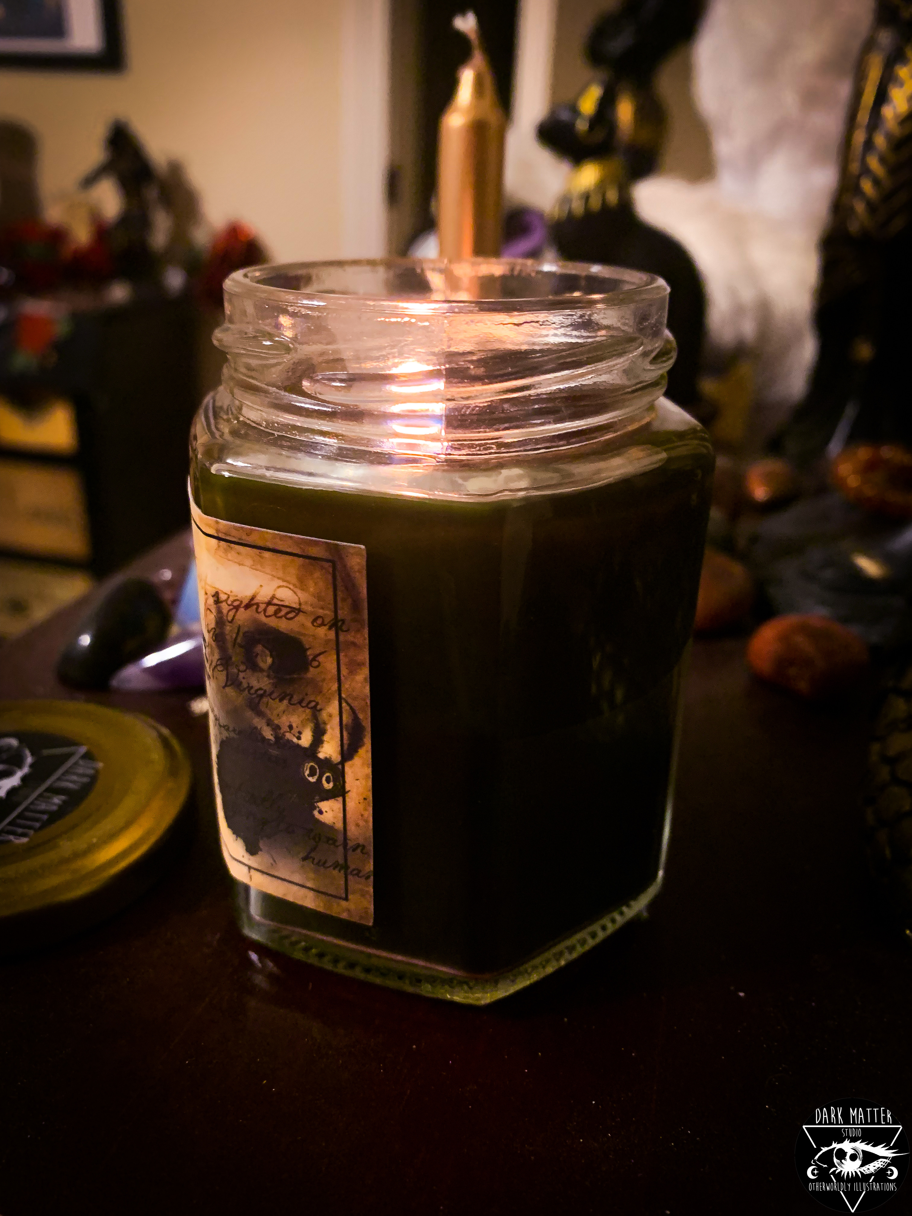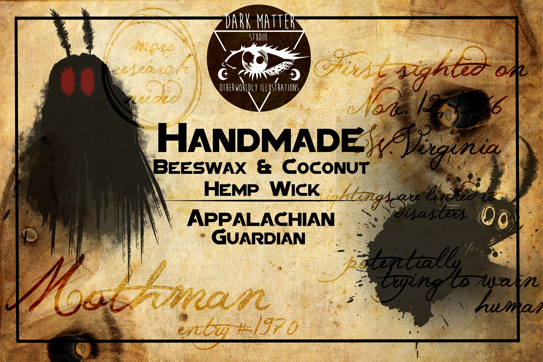 Organic white beeswax candles, made with coconut oil to help burn more evenly, and a hemp wick to make sure your wick burns at the same speed as the wax melts! Hand blended color and scent, 6oz, glass jar with metal cap. A blend of teakwood, sandalwood, pine, and cedar. Overtones of fresh leather, rum, sweet tobacco, and coffee. Infused together, this candle gives off that fresh, woodsy musk that screams Appalachia. A mild scent, the tobacco, leather, rum, and coffee overtones add to the profile to create the aroma of a village marketplace deep in the old mountains. This is a part of my Cryptid Studies collection, and this scent is inspired by the Cryptid Studies Mothman design. I wanted something that really captured an almost nostalgic scent-sation of late summer in the Appalachian Mountains. I lived near Gatlinburg, TN and the Smokeys for a few years, and when I was experimenting with the scent profile, I couldn't help but try to recreate the smells of Main Street, and all of the little shops in the village marketplace district. The fragrance is not so overpowering that it becomes irritating for those of the more sensitive variety when it comes to fragrances, and the best part about it? It's beeswax! What is so great about beeswax candles? They are long lasting for starters, so it'll last longer than a soy candle you buy from the drug store. Beeswax also releases negative ions when burning, which naturally purifies the air! It's perfect for allergens and asthma, and the added coconut oil means you can also use the melted wax as a moisturizer if you so choose since all the materials are skin-safe. (And for the adult cryptid-enthusiasts of the more, ahem, adventurous variety, all of my candles are safe to pour onto skin! The added coconut oil helps to lower the melting temperature of the wax, so it reduces the intensity of the heat!)